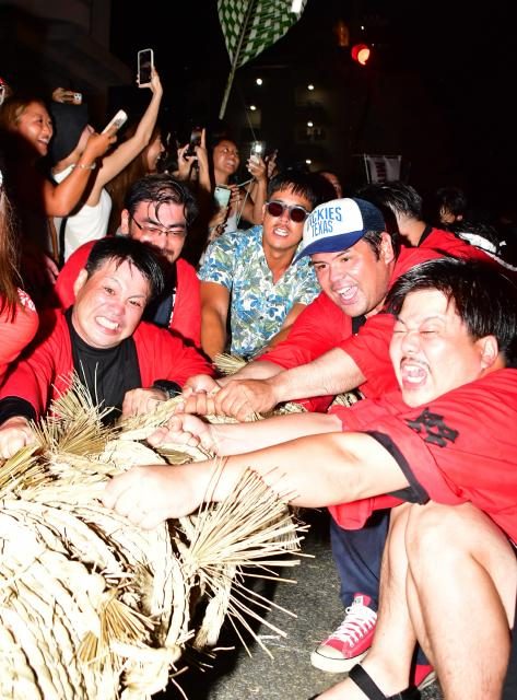 宮古島夏まつり2025(主催・同実行委員会)の2日目は26日、市公設市場前で、祭りのメインイベント東西大綱引きが行われた。市民や観光客らが大勢参加し、東西に分かれて綱を引き合った。東軍が勝利し、昨年の雪辱を果たして、向こう1年間の豊作が約束された。