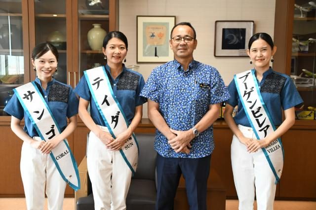 従来のミス宮古島に変わる初代宮古島観光アンバサダーに就任した3人が5日、市役所に砂川朗副市長を訪ね、「公務を通して多くの人に宮古島をPRしたい」と抱負を語った。