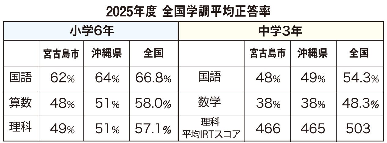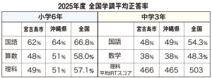 市教育委員会(宮城克典教育長)は16日までに、全国の小学6年生と中学3年生を対象に、今年4月に実施された2025年度全国学力・学習状況調査結果をまとめた。小学生の平均正答率は国語、算数、理科の3科目ともに県平均を下回った。中学生は理科(平均IRTスコア)が県平均を上回り、数学は同率、国語は下回った。市教委では「小、中学校の算数・数学は全国よりも平均正答率、平均正答数が下回っており課題」としている。