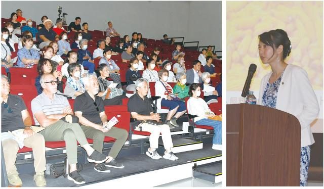 勉強会に参加した市民らと講師のうた桜子氏=21日、未来創造センター多目的ホール
