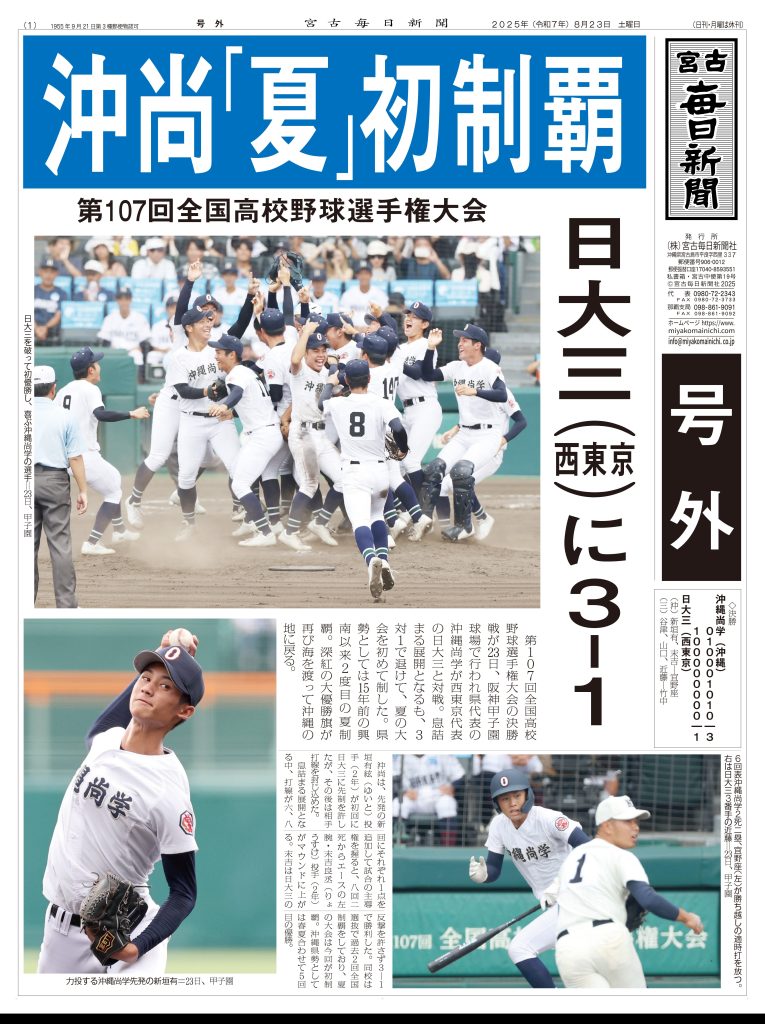 夏の甲子園決勝、沖縄尚学が日大三に3―1で勝利し、夏の甲子園初優勝を果たした。沖縄県勢の夏制覇は2010年に春夏を制覇した興南以来15年ぶり。