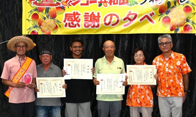 6月17日に開国し、23日に終了した「マンゴー共和国2025」のフィナーレ「感謝の夕べ」が28日、島の駅みやこで開催された。共和国大統領の嘉数登市長が好成績を残した生産者らを表彰した。最高売り上げは1092万円のリトルグローブ。今年は天候不良が影響し、出荷が例年より遅れたものの、期間中の合計販売額は1億1988万円だった。