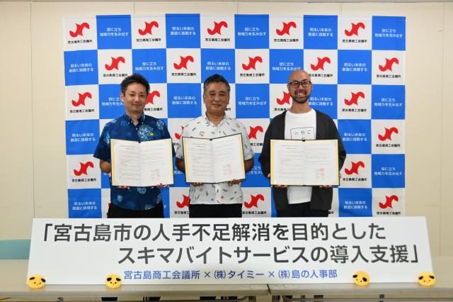 宮古島商工会議所(根路銘康文会頭)は29日、会員事業所における人材不足解消を目指してスキマバイトサービスのタイミー(本社・東京都、小川嶺代表)と連携協定を締結した。全国の商工会議所では18例目。本協定には「島の人事部」(本社・宮古島市、千田泰平代表)も加わっており、民間企業を含めた3者締結は全国初の取り組み。