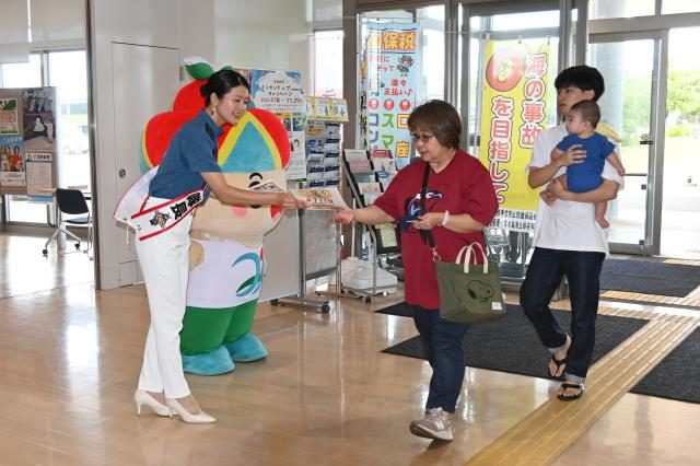 市消防本部は8日、2025年度「救急の日」および「救急医療週間」の一環で宮古島観光アンバサダーティダの小林南奈さんを一日救急隊長に任命した。市消防本部で辞令を受けた小林さんは救急隊員へ訓辞を述べた後、市役所で「救急車の適正利用を」などと書かれたチラシを配布し、市民に救急週間をPRした。