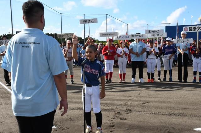 宮古青年会議所(宮古JC、比嘉正樹理事長)主催の第45回JC杯少年野球大会が13日、伊良部球場などで開幕した。開会式では低・高学年の両部門に出場する宮古、八重山、沖縄本島の総勢22チームが互いの健闘を誓った。代表で高学年・平一レンジャーズの下地剛愛さん(6年)が「応援してくれる皆さんへの感謝を胸に、最後まで全力で正々堂々プレーすることを誓う」と力強く宣誓した。