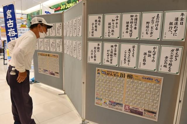 15日の敬老の日・老人週間にちなんだ第5回がんずう川柳(主催・宮古毎日新聞社)の作品展示が14日、サンエー宮古島シティでスタートした。21日まで。65歳以上で宮古島市在住または出身者による川柳79作品が展示され、訪れた買い物客らは一つ一つじっくりと見入っていた。