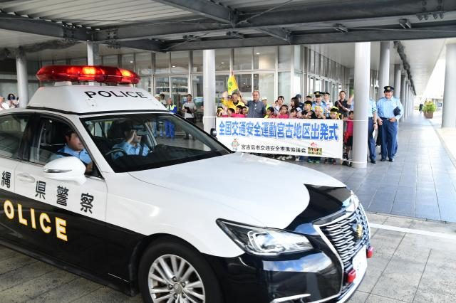 2025年秋の全国交通安全運動宮古地区出発式(主催・市交通安全推進協議会)が19日、市役所で行われた。宮古島署の署員や関係団体の職員、市民らが参加し、日本一交通安全な島を目指すことなどを誓った。出発式後は車両パレードで子供たちがパトカーを送り出し、交通安全の意識啓発を図った。同運動は21日から30日まで。