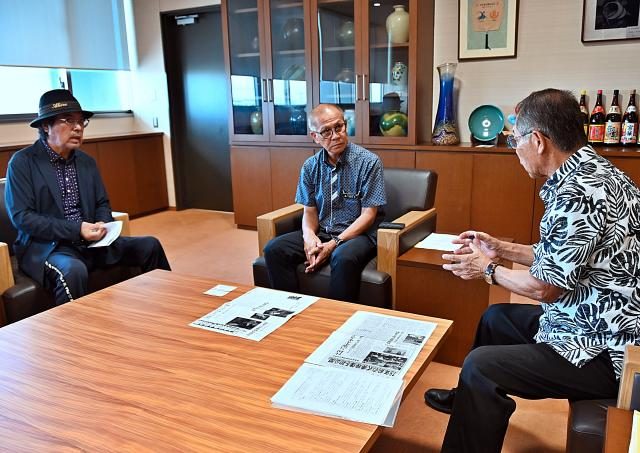嘉数市長(中央)に記念碑建立150周年式典の開催を要請した下地会長(左)、垣花副会長=19日、市役所