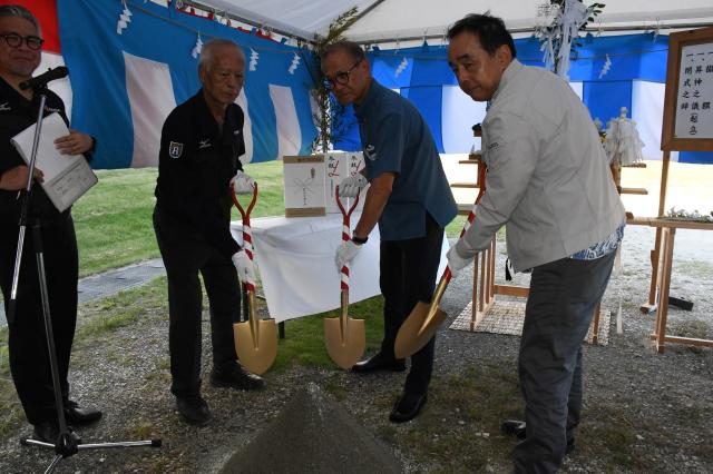 宮古島市は9日、伊良部島小中学校(結の橋学園)プール設置工事の安全祈願祭を同設置現場で執り行った。嘉数登市長や宮城克典教育長、同校の佐久本聡校長、先嶋建設(黒島一洋代表)、ながはま建築工房(長濵毅代表)ら施工、設計監理業者など関係者が出席し、児童生徒の健やかな成長に向けて工事期間中の無事故・無災害を祈念した。