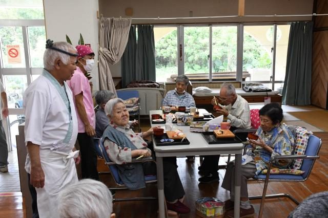 鮨処「浅草」(平良光正代表)は「すしの日」の1日、市上野の小規模多機能型居宅介護事業所たかやま(赤嶺鉄管理者)の利用者10人と職員に握りたてのすしを振る舞った。新鮮なマグロ、イクラ、エビなどのすしを頬張った利用者は「大将、おいしかった」「良い思い出になった。ありがとう」などと笑顔を見せた。