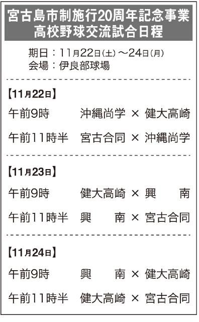市制施行20周年記念事業として県内外の強豪校を招いた「高校野球交流試合」が22日から24日までの日程で伊良部球場で行われる。4日、嘉数登市長が定例会見で発表した。参加するのは県内から甲子園で優勝した沖縄尚学、興南、県外からは群馬県の健大高崎で、宮古島の合同チームと3日間にわたり対戦する。嘉数市長は「高校球児の育成を図るとともに、伊良部屋外運動施設(野球場)を県内外に広くPRしていきたい」と話した。