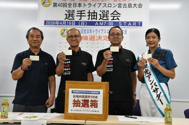 第40回全日本トライアスロン宮古島大会の出場者を決定する選手抽選会が11日、市役所で行われ、大会長の嘉数登市長らが抽選で最後の100人を選んだ。事前にコンピューターで選抜された1410人と合わせて、出場全1510人が決定した。地元枠(宮古島市・多良間村)の100人分の枠には91人の応募があり、全員が選ばれたことになる。選手への通知は21日にメールで行われる。