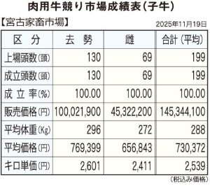 JAおきなわ宮古家畜市場の11月期肉用牛競りが19日、JAおきなわ宮古家畜市場で行われた。子牛1頭の平均価格は73万372円だった。前月から10万3539円値上がりした。子牛の平均価格が70万円を超えたのは、3年7カ月ぶりとなる。JAおきなわ宮古地区畜産振興センターは「全国的に値上がりしており、久米島など県内でも値上がりしている。上場頭数が少ないことも影響していることも考えられる。年末に向け、肉の需要が増えるためではないか」としている。