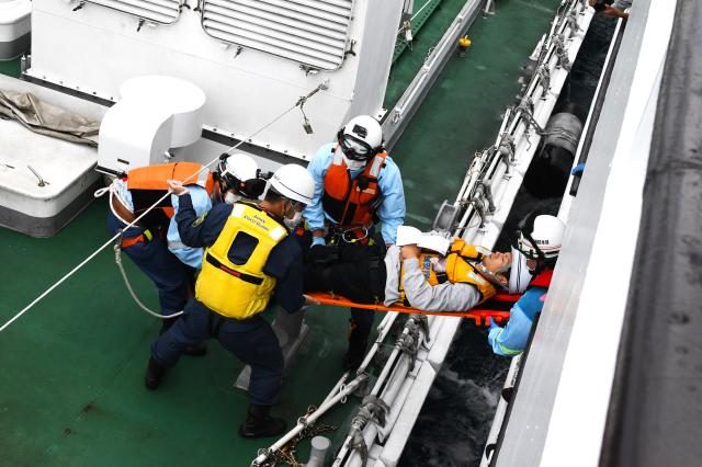 船内の多傷病傷者を搬送する合同訓練が実施された=25日、平良港沖