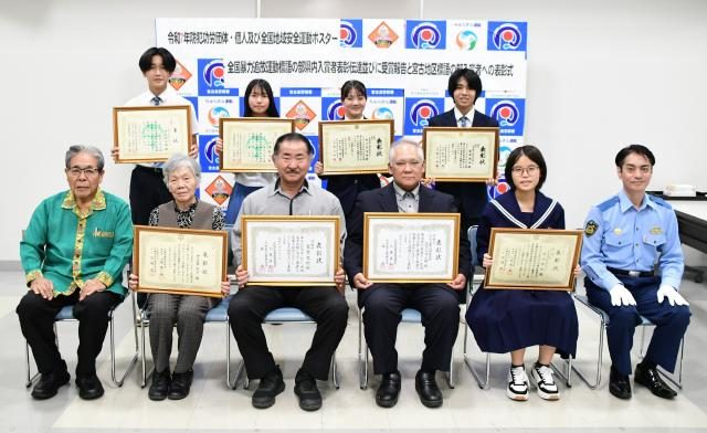 防犯功労団体・防犯功労者および全国地域安全運動ポスター・全国暴力追放運動標語の県内入賞者表彰伝達などされた皆さん=26日、宮古島署