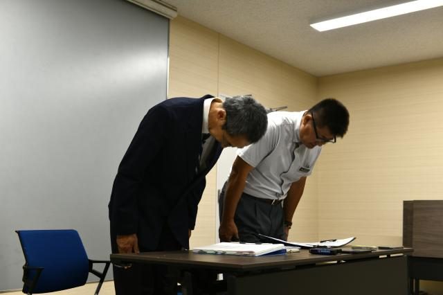 市環境衛生局の梶原健次局長らは28日、市役所で記者会見し、今年4月に供用開始された、新し尿等処理施設の電気室の床材が、仕様書と異なる資材を利用した状態で「工事完了」とし、防衛省から補助金の交付を受けたことに関して、沖縄防衛局(防衛省)に補助金455万6000円を返還したと発表した。返還する財源は市の一般財源で、梶原局長は「市民の皆さん、沖縄防衛局をはじめ関係者に深くおわびする」と謝罪した。