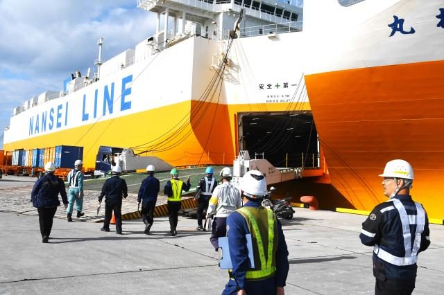 適切な荷役作業が行われているかパトロールで確認する参加者=4日、平良港内