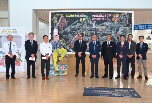 市制施行20周年事業「感謝の黒板アートオープニングセレモニー」が17日、市役所1階ロビーで開催された。黒板には2005年の5市町村合併協定調印式から20年の歩みが描かれている。さらに電灯も飾られ、嘉数登市長、砂川朗副市長、宮城克典教育長がカウントダウンとともに点灯した。アートは26日まで展示され自由に記念撮影ができる。
