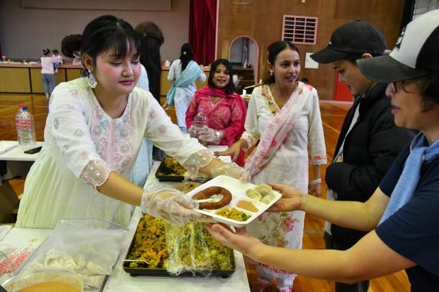 城辺福里にある宝塚医療大学観光学部は20日、同大宮古島キャンパス(旧城辺中学校)で世界交流フェスティバルを初めて開催した。同大学生の外国人46人が自国の代表的な料理を手作りし、地域住民らに振る舞った。珍しい料理の数々に住民らは各ブースを回って、おいしそうに料理を頬張りながら交流を深めた。