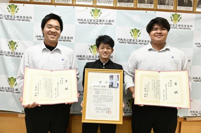 宮古工業高校(喜納兼信校長)で18日、第17回九州地区高校生溶接技術競技会の入賞報告が行われた。同競技会には3年生の平良蒼空さん、奥平翼さん、髙江洲翔夢さんの3人が出場し同校初となる3位入賞を果たした。個人でも平良さんは優秀賞、奥平さんは優良賞を獲得した。大会は今年8月に宮崎県で行われ、九州各県から9校41人が出場した。