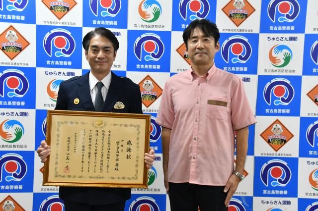 調査取締功労者・国税庁長官感謝状が22日、宮古島署(新垣健一郎署長)に贈られた。同署で伝達式が開かれ、沖縄国税事務所の剱持敏幸所長が新垣署長に感謝状が手渡された。