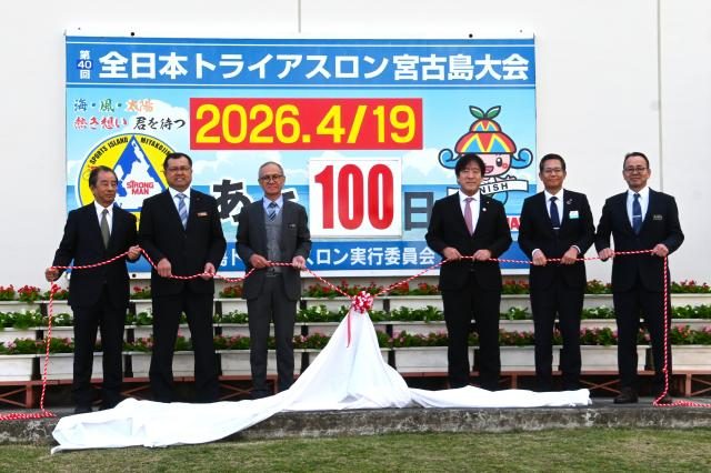 4月19日の第40回全日本トライアスロン宮古島大会開催まで残り100日となった9日、残暦板の除幕式が市役所で行われた。式では大会長の嘉数登市長はじめ、大会関係者らが出席、除幕のセレモニーで節目の記念大会開催に向け、より安全安心な大会へ取り組み、選手と市民で盛り上げていこうと決意を新たにした。