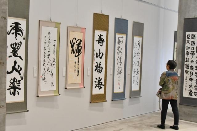会員らの力作が並べられている書心会展=17日、市未来創造センター市民ギャラリー