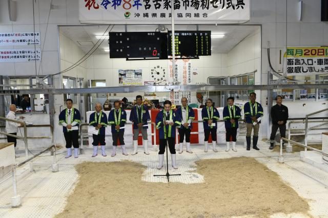 JAおきなわ宮古家畜市場の2026年肉用牛初競りが18日開かれた。生産農家や市場関係者が集い、畜産振興に向けた連携強化に取り組むことを誓いながら向こう一年間の高値取引を祈願した。初競りの子牛1頭平均価格は76万1456円の高額取り引きで幸先良いスタートを切った。