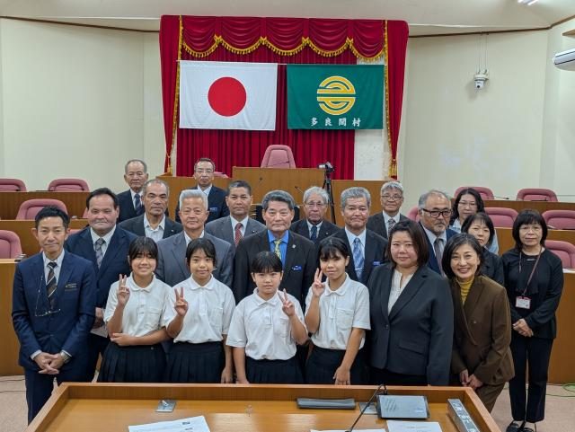 【多良間】2025年度沖縄離島体験・デジタル交流促進事業(県企画部地域・離島課主催)に参加した多良間小5年生4人による発表会が21日、村議場で行われた。児童たちは「美しい村を未来まで」をテーマに、自ら実施したアンケート調査に基づき、島のごみ問題解決に向けた具体的な提言を村長や村議員らの前で堂々と発表した。
