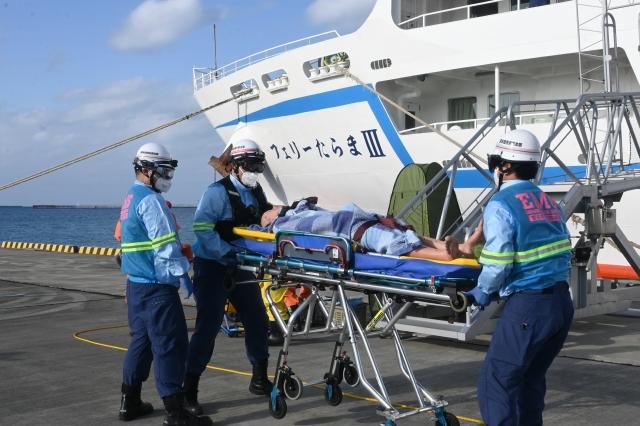 宮古島署(新垣健一郎署長)は29日、多良間海運、市消防本部、沖縄地区税関宮古島税関支署と合同で平良港に停泊中の「フェリーたらまⅢ」船内でのテロ発生を想定した対処訓練を実施した。犯人が持ち込んだ有毒ガスで負傷した乗客の救護や、搬送などの手順を確認した。