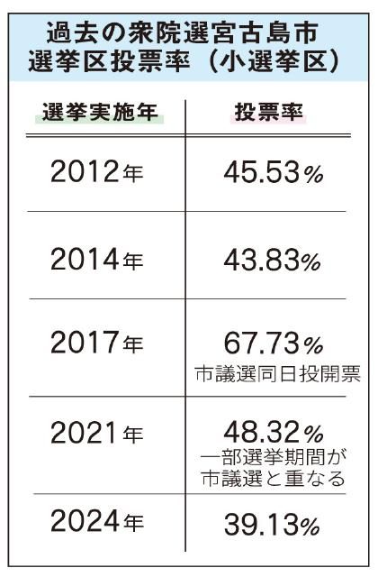 第51回衆院選の宮古島市における期日前投票は1月30日までの3日間で計944人と伸び悩んでいる。県内最低の39・13㌫だった前回選(2024年10月27日執行)と同様に30㌫台となる可能性が出てきた。前回と同じ4人が立候補した沖縄4区だが、超短期決戦となったことなどが影響して、有権者の関心が薄れることが懸念されており、各陣営とも「投票率が低いと厳しい」と危機感を募らせ、票の掘り起こしに力を入れている。