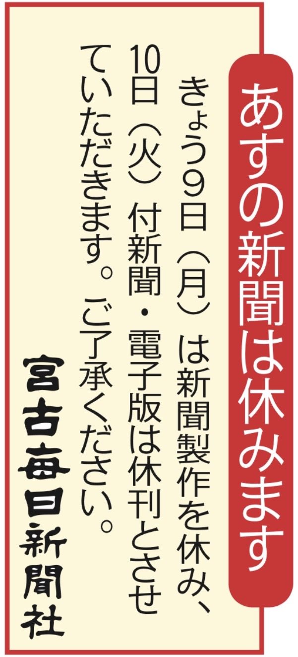 きょう9日(月)は新聞製作を休み、10日(火)付新聞•電子版は休刊とさせていただきます