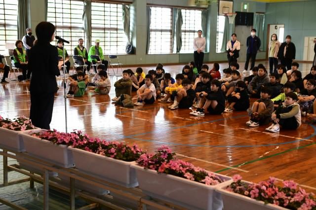 人権の花の前であいさつする亀川校長=10日、西城小学校