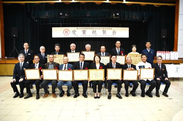 第33回県野菜品評会および県農林漁業賞受賞祝賀会(主催・JAおきなわ宮古地区野菜・果樹生産出荷連絡協議会)が13日、JAおきなわ宮古地区本部大ホールで開催された。会場には受賞者をはじめ県宮古農林水産振興センターの金城靖所長ら来賓のほか生産農家が出席し、2年連続で農林水産省農産局長賞を受賞した上地美香さん(下地支部)らを祝福するとともに島産野菜の品質向上へ決意を新たにした。