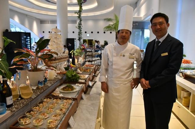 宮古島来間リゾートシーウッドホテル(谷圭右総支配人)は22日、開業6周年を記念した「スペシャル・ディナー・ブッフェ」を同ホテルビーチハウスレストランKISSHOで行った。市民ら80人が参加し、笹田勇治郎総料理長の特別なメニューを味わった。今年は天文台の開業を控えており、セカンドステージに向かうきっかけの会として企画された。