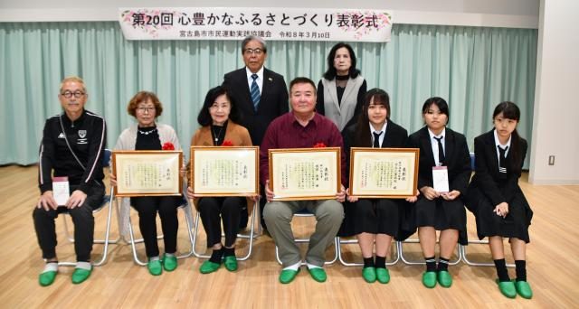 宮古島市市民運動実践協議会(前川尚誼会長)は10日「第20回心豊かなふるさとづくり表彰式」を市保健センターで行った。クリーン、グリーン、グレイシャスの3部会から選ばれた2個人3団体に表彰状と記念品が贈られた。受賞者らは、清潔で緑多い宮古島市の実現に向け、決意を新たにした。