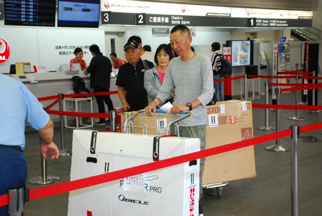 バイクなどの荷物を係員に預ける選手=16日、宮古空港