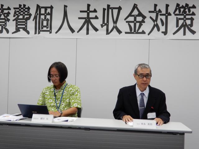 会見で未収金の縮減、解消に協力を呼び掛ける本永院長(右)=28日、宮古病院
