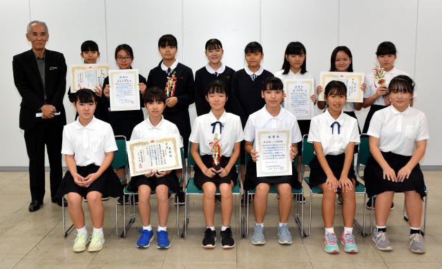 県アンサンブルコンテストで金賞と代表権を獲得し九州大会に出場する児童生徒=16日、市役所城辺庁舎