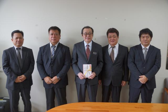 首里城復興に向けて寄付金を土木建築部の永山土木企画統括監(中央)に贈呈した(左から)宮古地区調査測量設計業協会の下地副会長、砂川会長、(右から)磁気探査業協会の宮國副会長、上里会長=19日、県庁