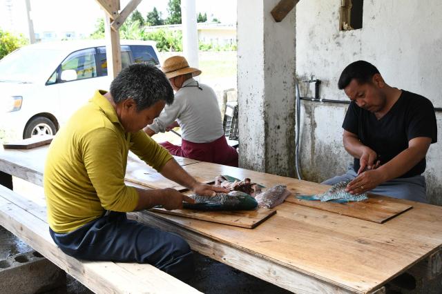 神に供える魚などを調理するクバン座のメンバー=18日、大木公民館