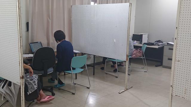 事業者が訪れ端末を使い担当者と申請作業を行っていた=19日、宮古島商工会議所