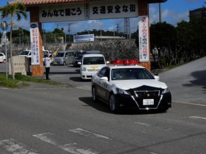 市民に交通安全意識啓発を行うため車両パレードが行われた=18日、市陸上競技場駐車場前