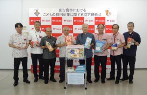 日本郵便沖縄支社、市、市社会福祉協議会の3者が協定書に調印しフードドライブをスタートさせた=9日、宮古郵便局