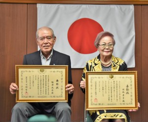 国税庁長官表彰を受けた野津さん(左)と、沖縄国税事務所長表彰の羽地さん=6日、那覇市の沖縄国税総合庁舎