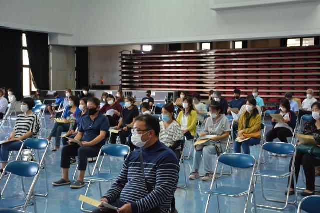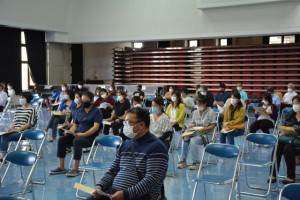 来年4月に開校する城東中の説明に聞き入る参加者=11月29日、城辺公民館