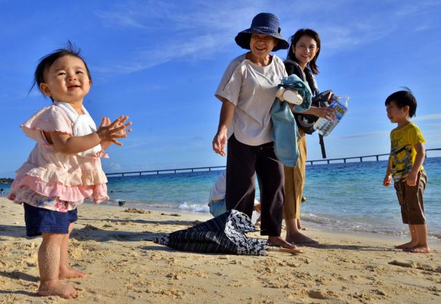 師走に夏日となった海岸では、マリンスポーツや海水浴を楽しむ観光客や家族連れの姿が見られた=18日、前浜ビーチ
