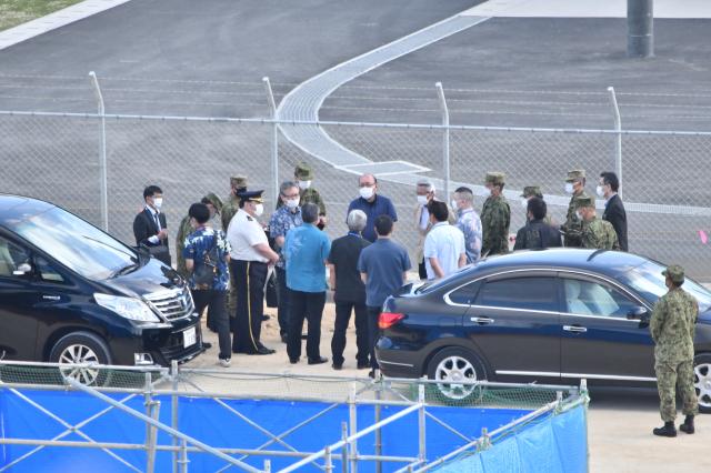 陸上自衛隊宮古島駐屯地や沖縄防衛局の職員が座喜味市長や市職員に施設の概要を説明した=7日、城辺保良の保良訓練場弾薬庫前