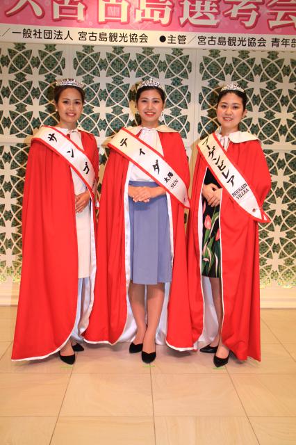 第47代ミス宮古島に選ばれた(左から)ミスサンゴの久貝さん、ミスティダの伊川さん、ミスブーゲンビレアの砂川さん=15日、市内のホテル