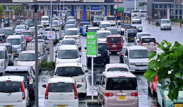 観光客の多さを物語るように、地元の買い物客の車に加え、多くのレンタカーで混み合った=12日、市内の大型スーパーの駐車場
